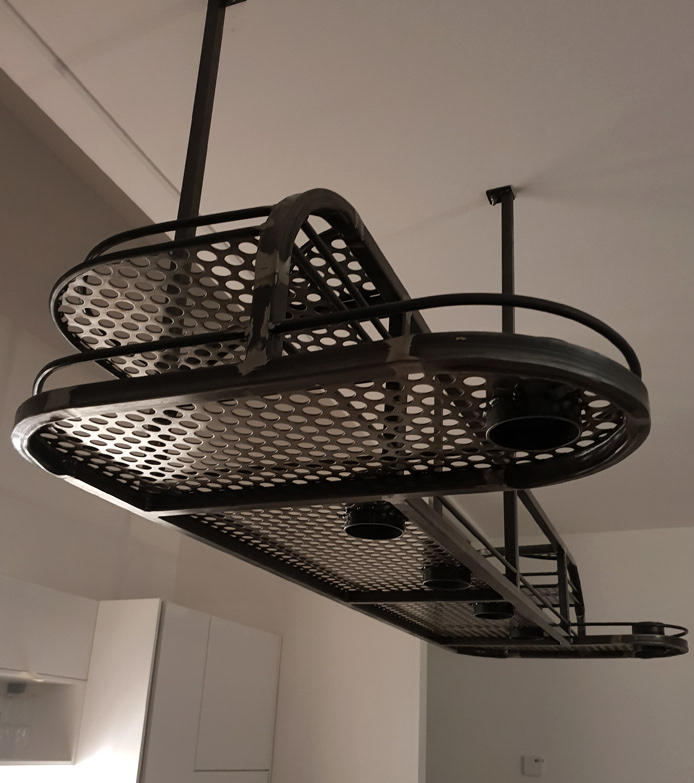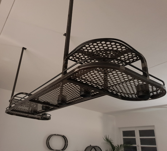 Hangplateau met geperforeerd staalplaat en hand gewalste profielen.